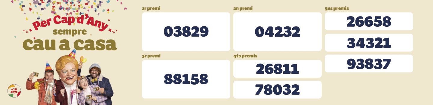 El primer premi ha recaigut sobre el 03829 i són 200.000 euros per cada bitllet de 10 euros. El segon premi, el 04232 atorga 65.000 euros per bitllet; el tercer, el 88158 son 30.000 euros. Els quarts premis guanyen 10.000 euros per bitllet -26811 i 78032-i els cinquens premis -26658, 34321 i 93837- són 5.000 euros per bitllet.